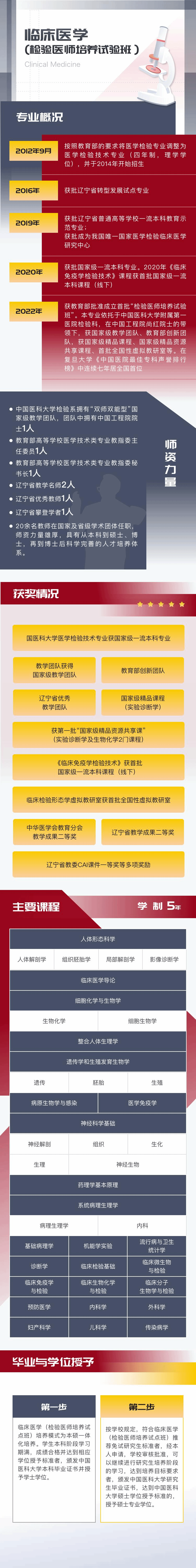 2022年获教育部批准成立首批“检验医师培养试验班”。本专业依托于中国医科大学附属第一医院检验科,在中国工程院尚红院士的带领下,获国家级教学团队、教育部创新团队,获国家级精品课程、国家级精品资源共享课程、首批全国性虚拟教研室等。在复旦大学《中国医院最佳专科声誉排行榜》中连续七年居全国首位,2019年获批成为我国唯一国家医学检验临床医学研究中心。