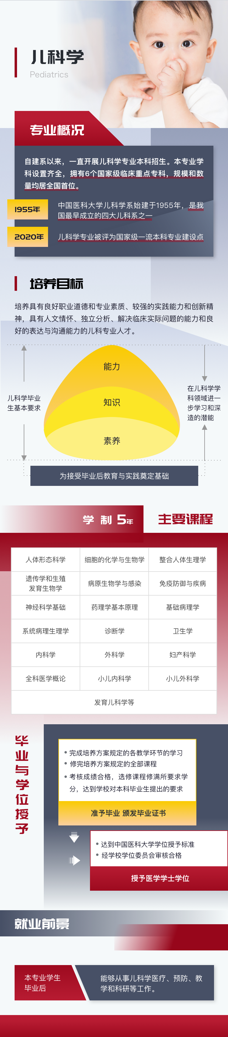 中国医科大学儿科学系始建于1955年,是我国最早成立的四大儿科系之一。自建系以来,一直开展儿科学专业本科招生。本专业学科设置齐全,拥有6个国家级临床重点专科,规模和数量均居全国首位。2020年儿科学专业被评为国家级一流本科专业建设点。