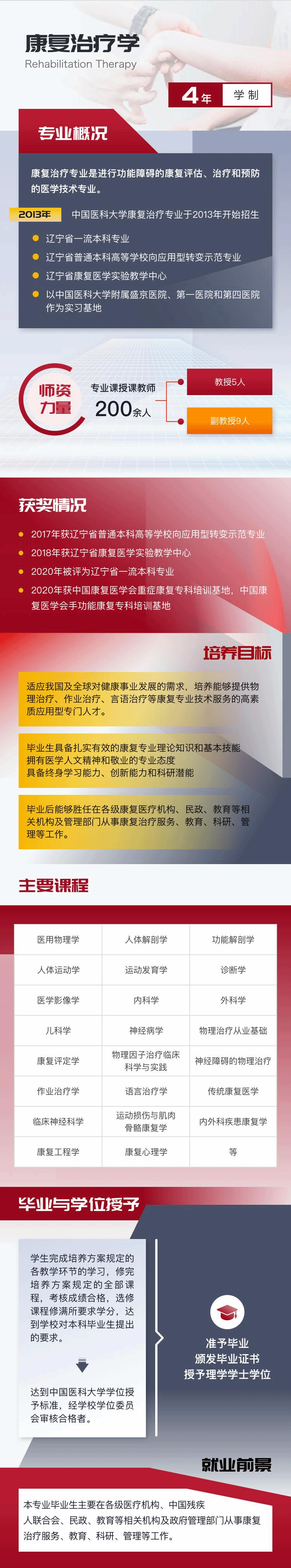 康复治疗专业适应我国及全球对健康事业发展的需求,培养能够提供物理治疗、作业治疗、言语治疗等康复专业技术服务的高素质应用型专门人才。毕业生具备扎实有效的康复专业理论知识和基本技能;拥有医学人文精神和敬业的专业态度;具备终身学习能力、创新能力和科研潜能,毕业后能够胜任在各级康复医疗机构、民政、教育等相关机构及管理部门从事康复治疗服务、教育、科研、管理等工作。