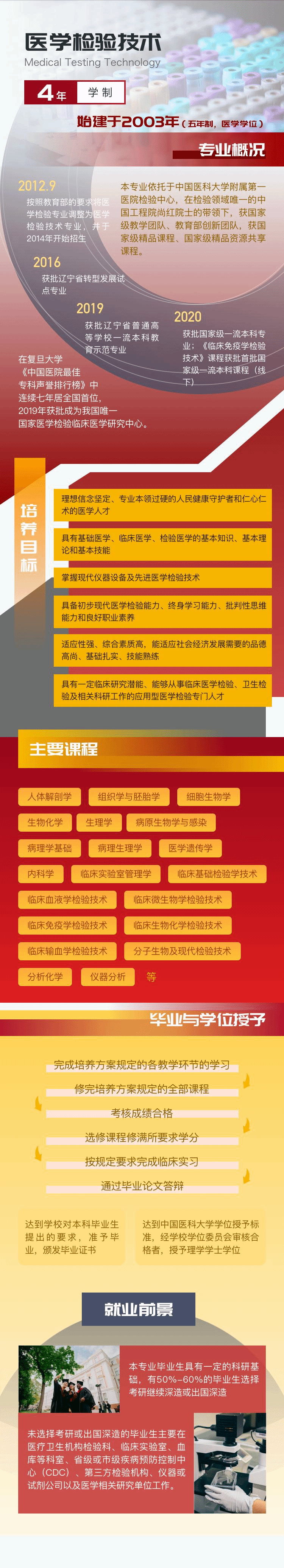 医学检验专业始建于2003年(五年制,医学学位),2012年9月,按照教育部的要求将医学检验专业调整为医学检验技术专业,并于2014年开始招生,2016年获批辽宁省转型发展试点专业,2019年获批辽宁省普通高等学校一流本科教育示范专业,2020年获批国家级一流本科专业,2020年《临床免疫学检验技术》课程获批首批国家级一流本科课程(线下)。本专业依托于中国医科大学附属第一医院检验中心,在检验领域唯一的中国工程院尚红院士的带领下,获国家级教学团队、教育部创新团队,获国家级精品课程、国家级精品资源共享课程。在复旦大学《中国医院最佳专科声誉排行榜》中连续五年居全国首位,2019年获批成为我国唯一国家医学检验临床医学研究中心。