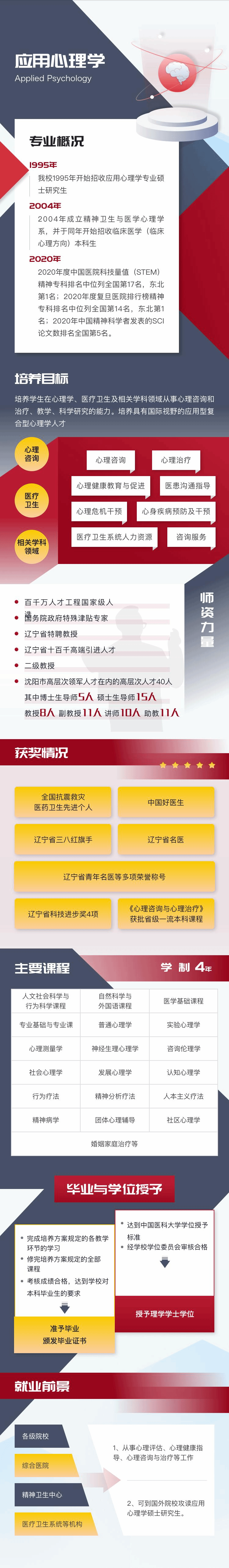 我校1995年开始招收应用心理学专业硕士研究生,2004年成立精神卫生与医学心理学系,并于同年开始招收临床医学(临床心理方向)本科生。专门培养在医疗卫生及相关领域从事心理咨询和心理治疗、心理健康教育与促进、心身疾病预防及干预、医患沟通指导、心理危机干预、医疗卫生系统人力资源、咨询服务等工作。培养学生在心理学、医疗卫生及相关学科领域从事心理咨询和治疗、教学、科学研究的能力。培养具有国际视野的应用型复合型心理学人才。
