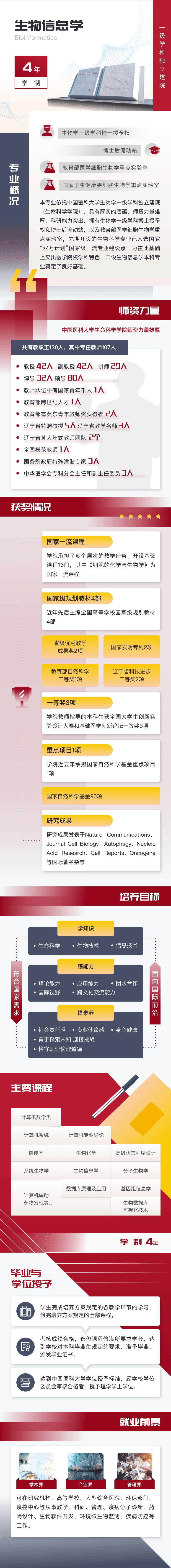 本专业依托中国医科大学生物学一级学科独立建院(生命科学学院),具有厚实的底蕴,师资力量雄厚,科研能力突出,拥有生物学一级学科博士授予权和博士后流动站,以及教育部医学细胞生物学重点实验室,先期开设的生物科学专业已入选国家“双万计划”国家级一流专业建设点,为在此基础上突出医学院校学科特色,开设生物信息学本科专业奠定了良好基础。