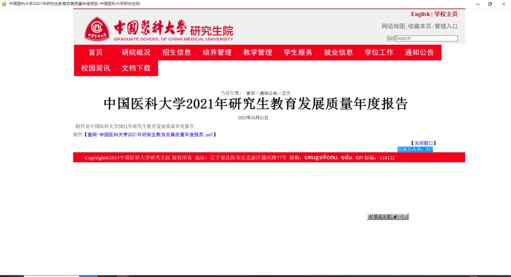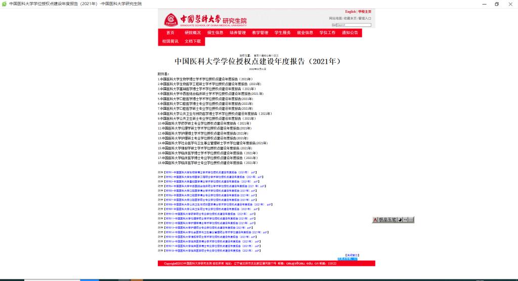根据《学位授权点合格评估办法》(学位〔2020〕25 号)、《关于开展学位授权点合格评估工作的通知》(学位〔2020〕26 号)和辽宁省学位委员会《转发国务院学位委员会教育部关于开展 2020—2025 年学位授权点周期性合格评估工作的通知》(学位〔2021〕1 号)及《中国医科大学 2020-2025 年学位授权点周期性合格评估方案》(医大校发〔2021〕138 号),由于网站更新,现重新发布我校参评的2021年度学位授权点建设报告和研究生教育发展质量年度报告(原公示详见下图)。