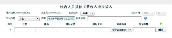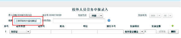5、请您认真核对校内职工工号,避免重名混淆;认真核对校外人员姓名、身份证号码、银行卡号。姓名、身份证号错误会导致税务局报税失败!暂存盛京、暂存建行混淆将会导致打卡失败!