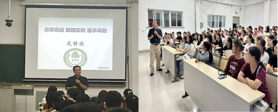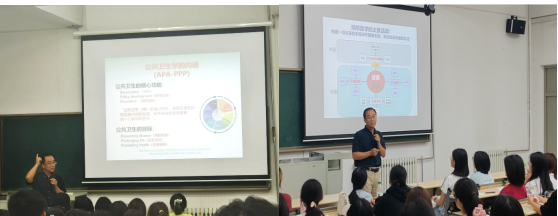 接下来,皮静波教授从专业视角出发,讲解了现代公共卫生与预防医学的内涵、核心功能和两者之间关系。在此基础上,他通过列举当下全球面临的热点公共卫生问题,说明了公共卫生学科发展态势和预防医学专业即将迎来的机遇和挑战。进而,皮静波教授带领学生们认识他们的新家园——公共卫生学院,展示了学院现有的丰厚科研、教学一系列平台、基地以及学业发展机会。同时,也让同学们了解了本专业的未来职业发展规划和就业形势,以增强同学们对本专业的认同感和职业归属感。