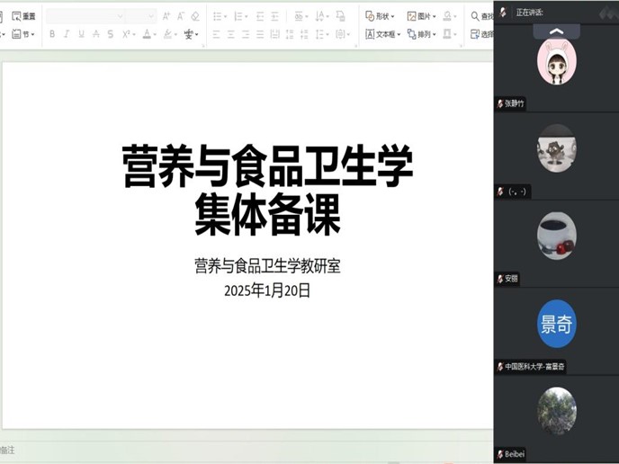 2025年1月20日,营养与食品卫生学教研室为进一步提升本科教学质量,以腾讯会议方式开展了新学期线上集中备课工作。首先,教研室全体教师就预防医学专业开设的专业核心课程《营养与食品卫生学》、临床医学5+3一体化及临床医学等专业开设的执业医师相关课程《预防医学》、公共事业管理专业开设的《卫生学概论》以及健康服务与管理专业开设的《卫生学》等不同轨道的课程教学安排及授课内容展开讨论,从教材选定、教学内容、教学课件、教学大纲到教案逐个进行深入探讨,明确学校对本科教学授课过程中的相关要求;同时,针对临床执业医师和公共卫生执业医师考试大纲,重点强化涉及本课程的知识点,强调每节课堂要突出重点难点。其三,对新任授课教师安排了新教师试讲环节。