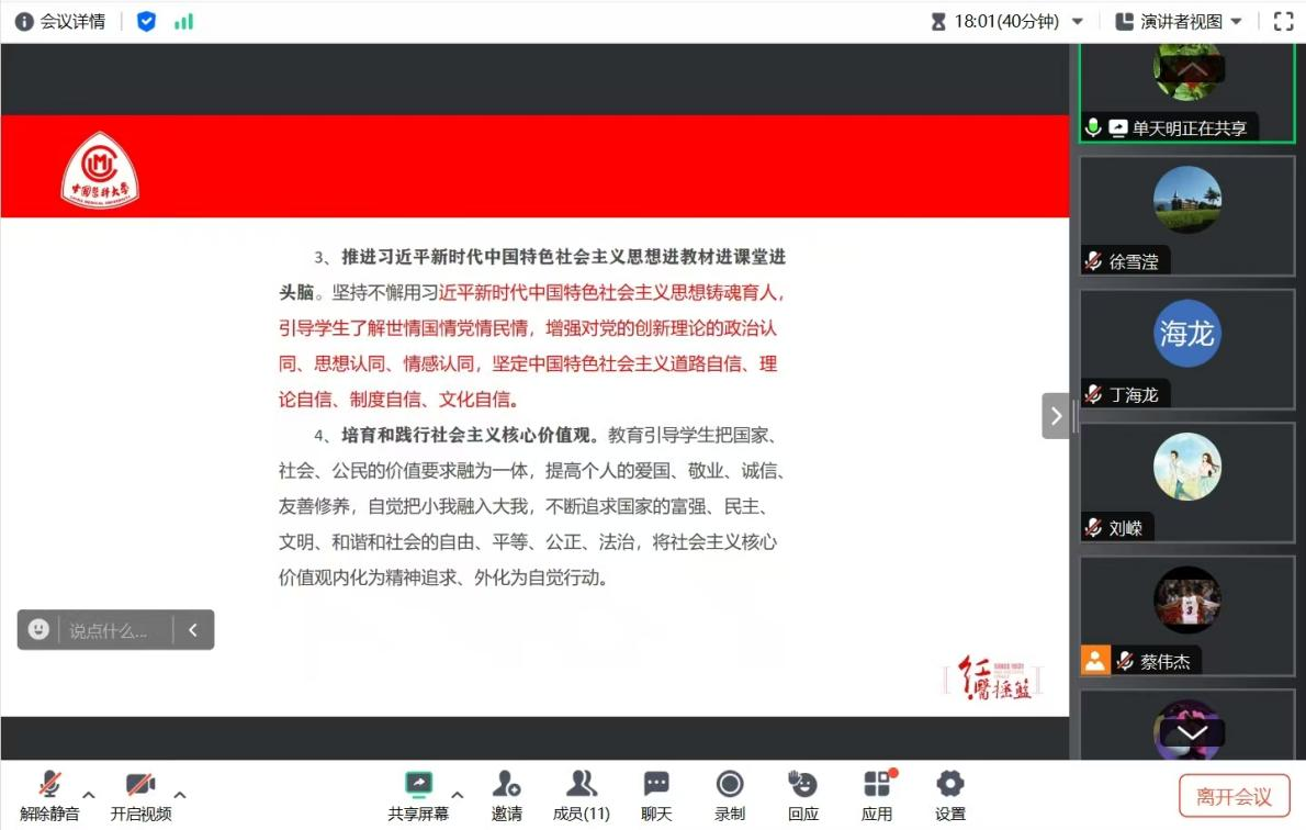 为深入贯彻落实习近平总书记关于教育的重要论述和全国教育大会精神,全面推进高校课程思政建设,公共卫生学院卫生统计学教研室与马克思主义学院研究生思想政治理论课教研室于2025年1月21日上午10:00联合开展了“手拉手”课程思政集体备课活动。此次活动由马克思主义学院研究生思想政治理论课教研室单天明老师主持,公共卫生学院副院长、卫生统计学教研室主任刘红波教授进行发言总结,会议由腾讯会议同步直播,卫生统计学教研室教学秘书蔡伟杰负责记录。会议主要围绕以下方面展开学习与讨论: