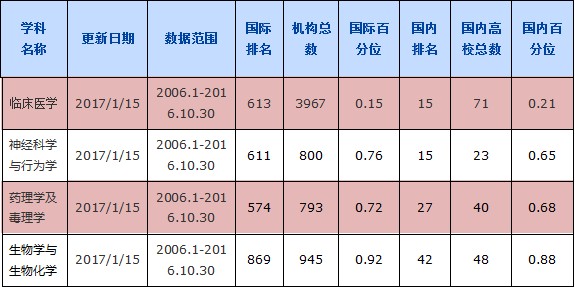 据2017年1月的最新一期ESI数据:我校国际排名第1163位,国内排名第59位,国内同类高校排名第7位, 辽宁省内排名第2位(第1位是大连理工大学);临床医学、神经科学与行为学、药理学与毒理学、生物学与生物化学等4个学科领域进入了世界排名前1%的行列。具体排名情况见下表。数据由我校图书馆分析整理2017年1月最新ESI数据库所得。