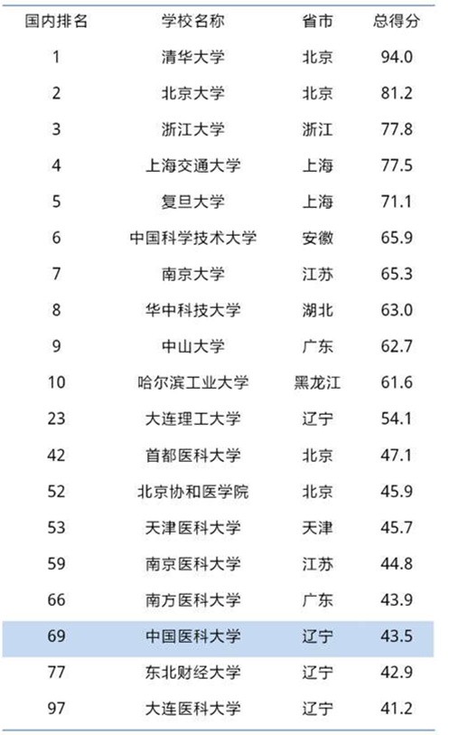 2月27日,上海软科教育信息咨询有限公司正式发布2017“中国最好大学排名”,展示了中国综合实力最强的500所大学,我校名列全国第69位,在辽宁省位居大连理工大学、东北大学之后列第3位,在全国独立办学的医科院校中名列第6位,部分大学排名情况见下表。