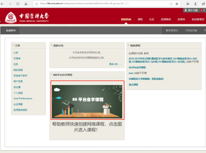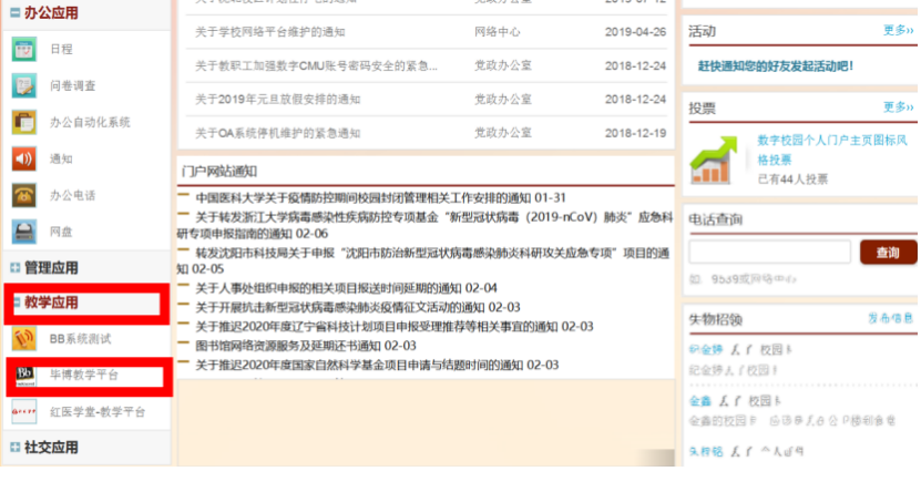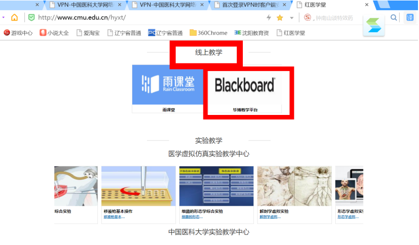 方式一:登录学校教务处网站“红医学堂”网址:http://www.cmu.edu.cn/hyxt/“线上教学”栏目下的“毕博教学平台”进入