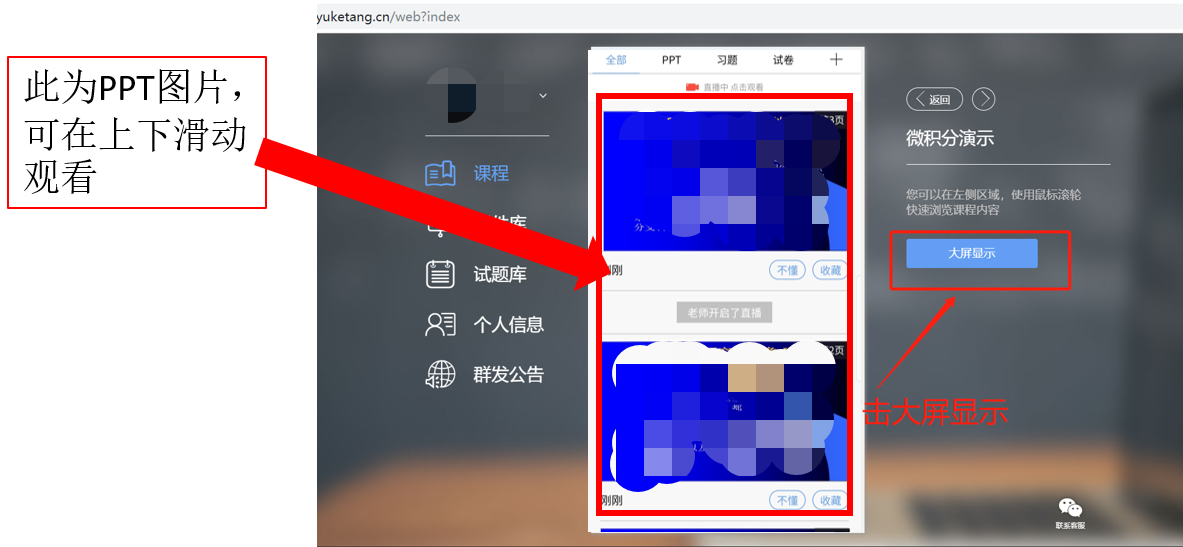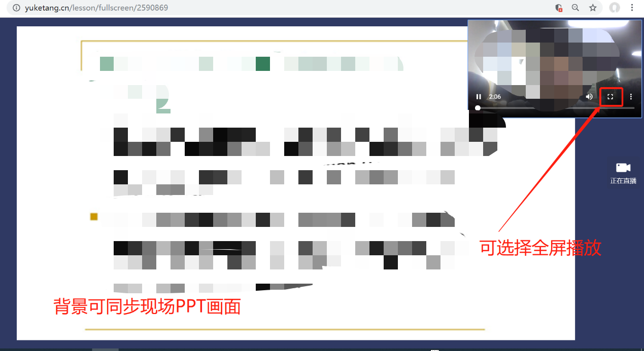 进入课程观看页面后,按照图12的箭头指示点击进入当前直播页面,选择【进入大屏显示】,如图13所示,即可进入大屏直播页面,如图14所示。当教师发送习题时,请回到图13界面或者在手机界面上进行作答。