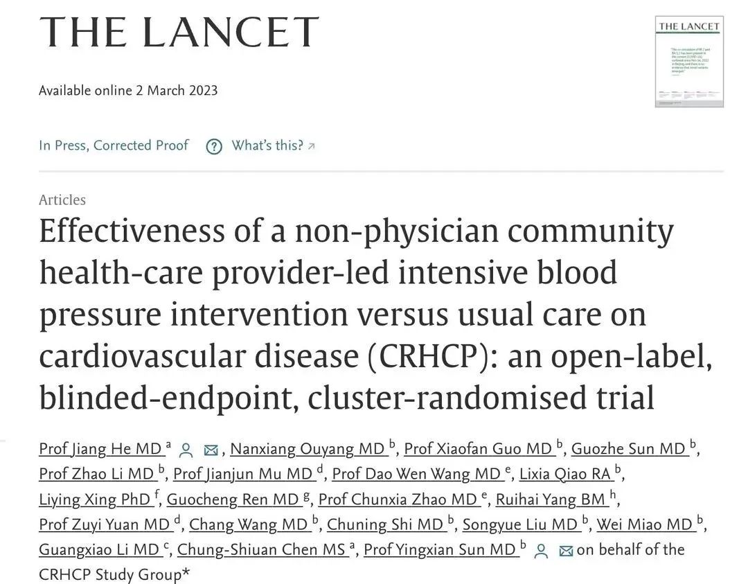 3月2日,中国医科大学附属第一医院心血管内科孙英贤教授团队承担的国家十三五重点研发项目——中国农村高血压控制项目(CRHCP)II期结果:《非临床医师社区卫生保健工作者主导的强化降压干预策略在降低心脑血管事件中的效果:一项开放标签、结局设盲、整群随机对照研究》再次在线发表于国际医学顶刊《柳叶刀》(The Lancet)杂志(IF=202.731)。