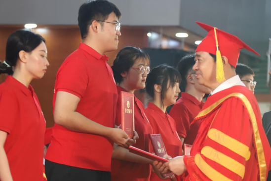 闫灵均主持毕业典礼,尹峰宣读表彰文件,刘莹宣读毕业文件和学位授予文件。校领导向优秀毕业生代表颁发荣誉证书。