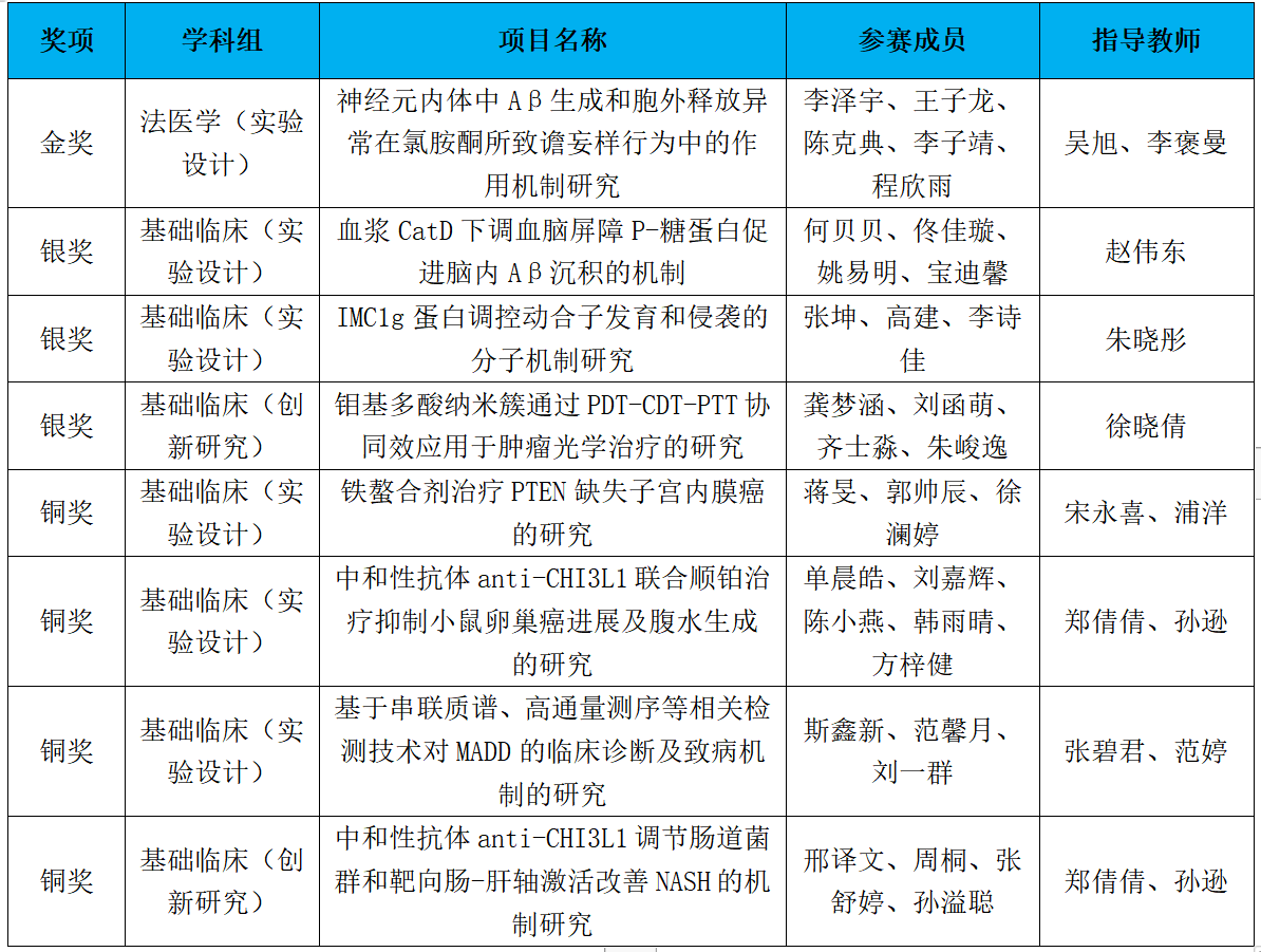 8月25日-28日,由高等学校国家级实验教学示范中心联席会基础医学组、高等学校基础医学创新创业协同育人工作组主办、陆军军医大学承办的第九届全国大学生基础医学创新研究暨实验设计论坛在重庆举办。在本届国赛中,我校共选派8支代表队参赛,他们表现优异,获得金奖1项、银奖3项、铜奖4项,学校获得优秀组织奖。