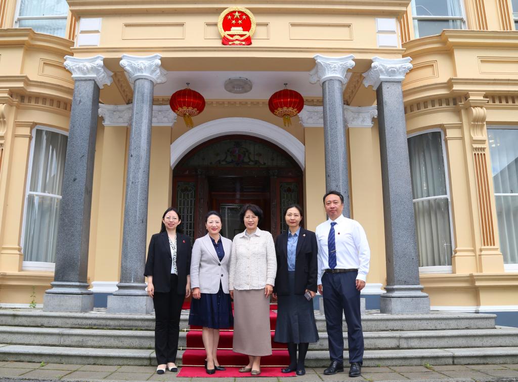 在英访问期间,中华人民共和国驻贝尔法斯特总领事馆总领事张美芳亲切接见了我校人员。她对中国医科大学的合作办学成就表示祝贺。张美芳表示,总领馆将全力支持双方在合作办学、师资培训等领域合作,助力推动高等教育高水平对外开放。随后,刘莹一行前往贝尔法斯特市市政厅与贝法市市长瑞恩·墨非、欧洲及国际关系主管劳拉·莱昂纳德进行会见。瑞恩·墨非向两校合作办学取得的非凡成就及推进沈阳-贝法姐妹城市所作出的重要贡献表示祝贺与肯定。刘莹表示,中英联合学院不仅是两校间的重要合作,同时对于推进贝法与沈阳、英国与中国的友好关系都作出了积极的努力与贡献。