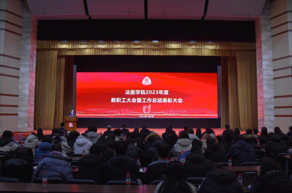 法医学院院长、副书记吴旭代表领导班子作法医学院2023年度工作总结报告。吴旭系统梳理了2023年度法医学院工作完成情况和取得的成效;深度剖析了学院当前发展面临的形势和存在问题;部署了2024年工作计划及要点内容。吴旭号召全院师生要坚持以习近平新时代中国特色社会主义思想为指导,抓住高质量发展的关键节点,携起手来、团结一心,以饱满的热情和昂扬的斗志,迎接新的挑战、开辟新的局面,为学校高质量发展贡献力量。