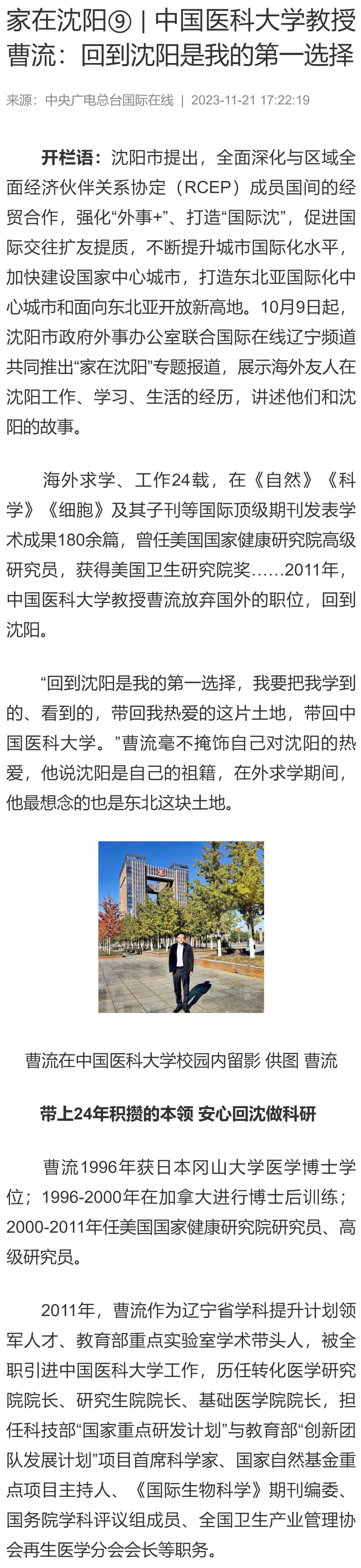 【中央广电总台国际在线】家在沈阳⑨ | 中国医科大学教授曹流:回到沈阳是我的第一选择