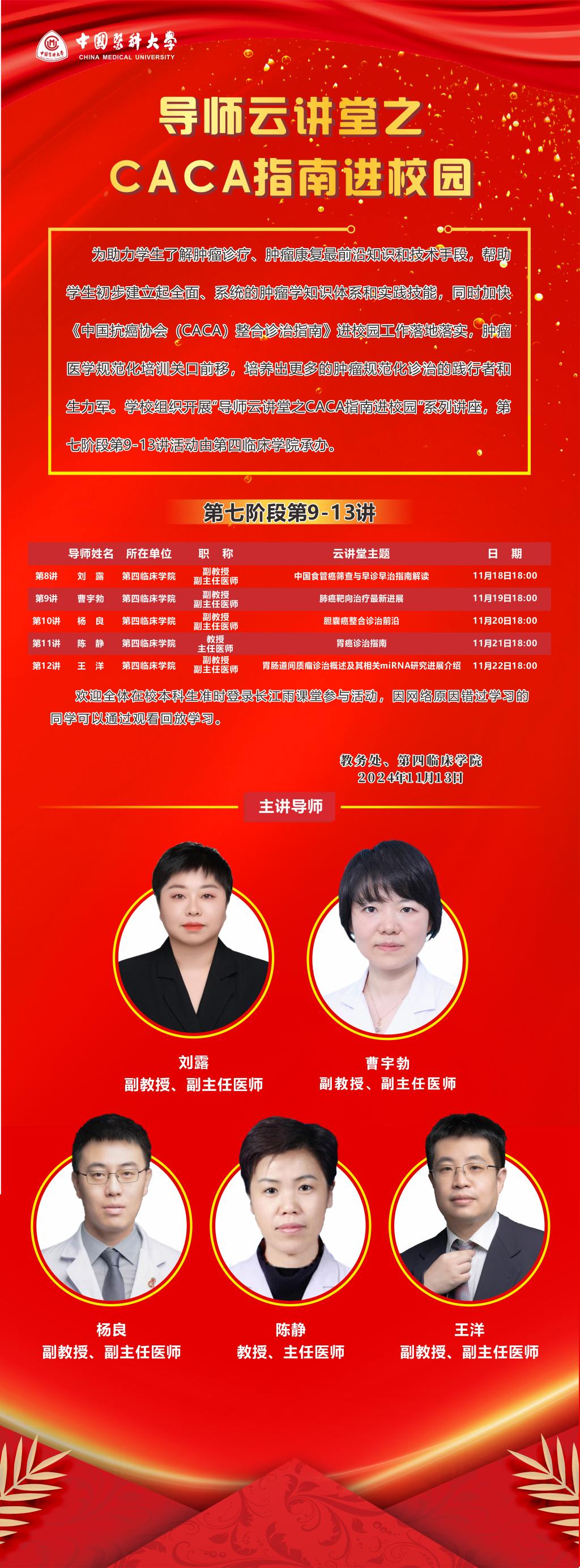 为助力学生了解肿瘤诊疗、肿瘤康复最前沿知识和技术手段,帮助学生初步建立起全面、系统的肿瘤学知识体系和实践技能,同时加快《中国抗癌协会(CACA)整合诊治指南》进校园工作落地落实,肿瘤医学规范化培训关口前移,培养出更多的肿瘤规范化诊治的践行者和生力军。学校组织开展“导师云讲堂之CACA指南进校园”系列讲座,第七阶段第9-13讲活动由第四临床学院承办。