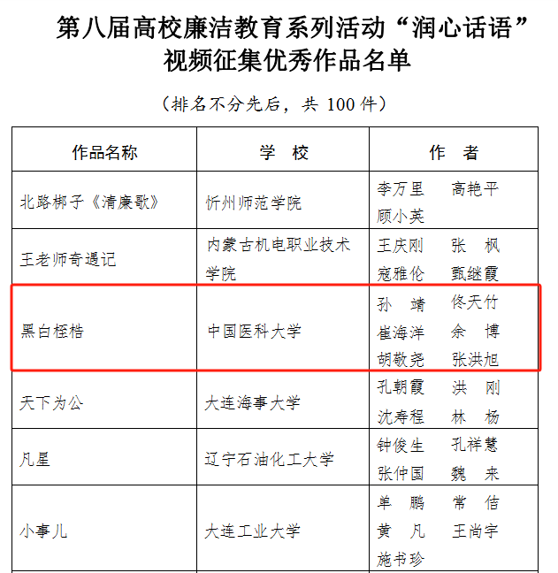 近日,教育部办公厅公布第八届高校廉洁教育系列活动评选结果。由学校纪委推选报送,第四临床学院、附属第四医院创作的视频短片《黑白桎梏》成功入选“润心话语”视频征集优秀作品(全省共4部)。