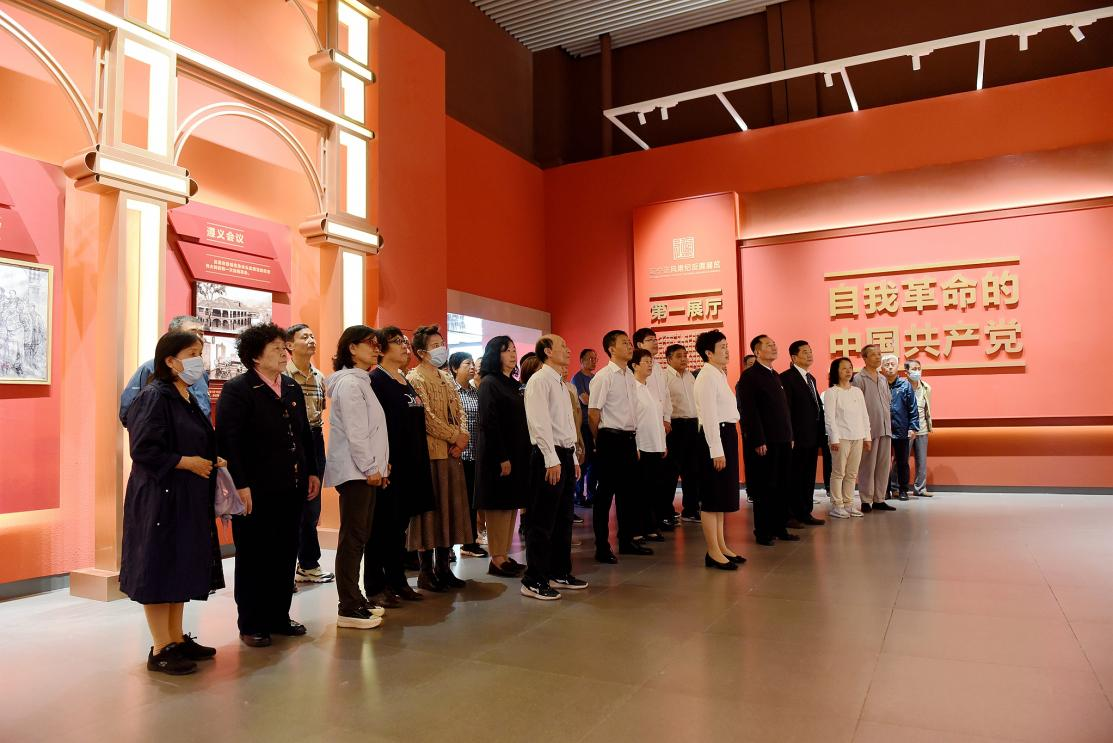 在展览馆正厅,中国医科大学党委原副书记夏子章带领大家重温入党誓词。全体党员庄严肃立,高举右拳,面向党旗庄严宣誓。大家心潮澎湃,像刚刚入党一样热血沸腾。在坚定为共产主义事业奋斗终生的理想信念的同时,牢记党的宗旨和纪律,把遵规守纪刻印在心,知敬畏、存戒惧、守底线,永葆共产党员忠诚干净担当的政治本色。