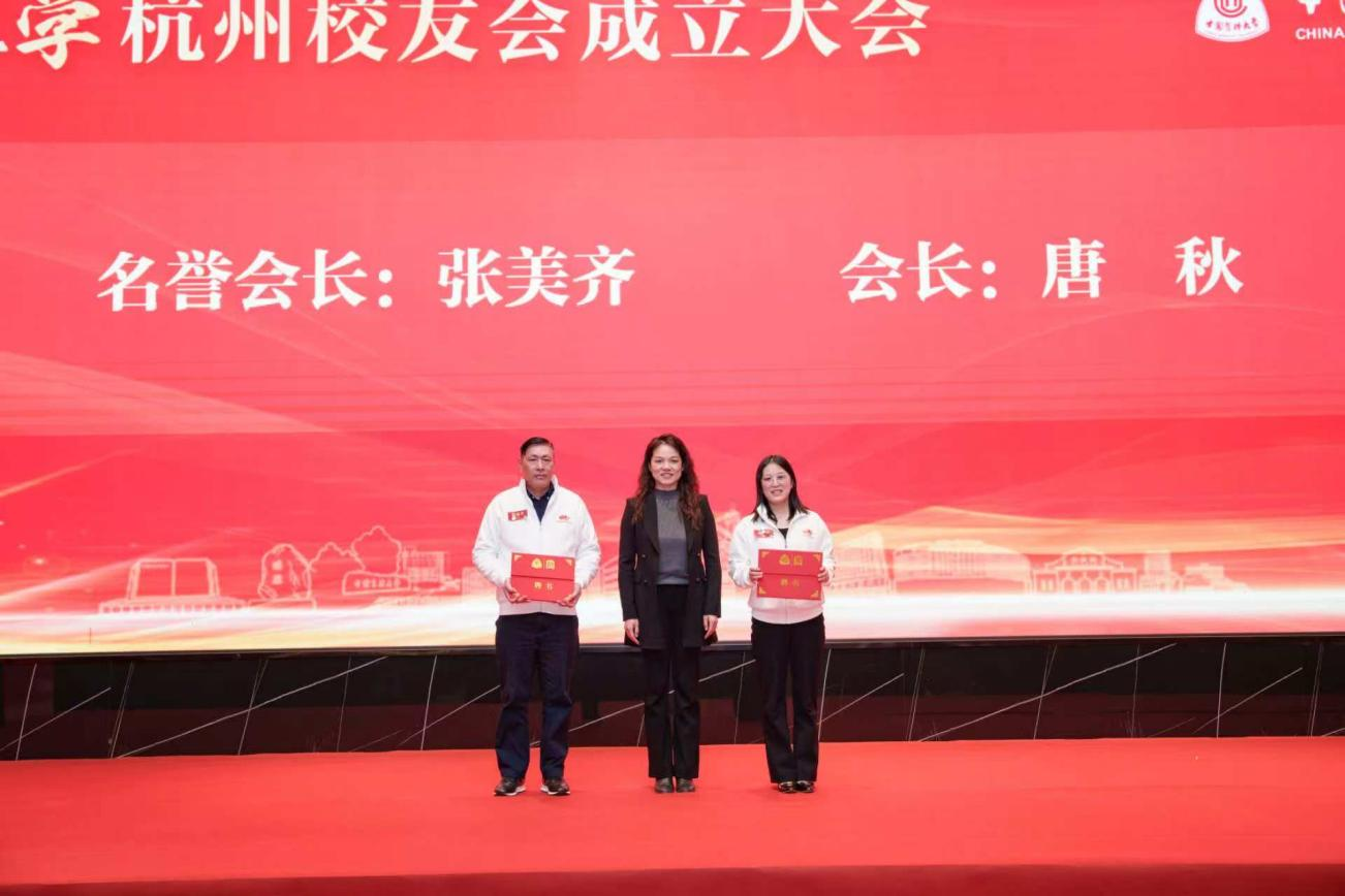 在与会嘉宾、校友们的共同见证下,徐苑苑向杭州校友会授旗,并为杭州校友理事会成员颁发聘书。