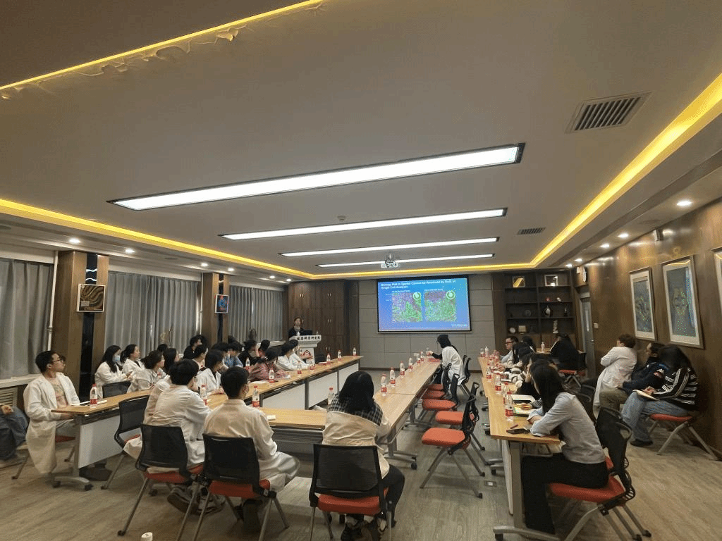 本期讲座以“开启单细胞空间分析新时代-精细解析组织细胞异质”为主题,谭波博士从基本理论、实际应用、技术支持及已发表相关案例的角度,对Spatial Molecular Imaging(SMI)空间分子成像技术进行了深入浅出的介绍。该技术允许科研工作者们在全景切片层面上实现1000色以上的RNA标记,以及64色以上的蛋白标记,是单细胞/单分子空间组学技术领域的最新研究成果。谭博士还进一步对比了传统单细胞和单核测序技术与单分子空间转录组学的差异,及SMI应用的必要性和发展潜能,其深刻详细的演讲深深吸了同学们,令在座的师生获益良多。报告后,同学们更是结合自身课题对SMI技术的应用前景与谭博士进行了深入和激烈的讨论,现场学术气氛浓厚。