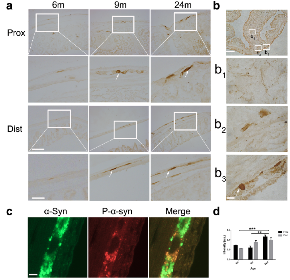 通过对过表达a-syn的转基因小鼠肠道的观察,我们发现随着年龄增加(6月、9月及24月龄),BAC-α-syn-GFP鼠肠蠕动速度变慢,结肠中a-syn的含量及其磷酸化程度随着年龄的增加逐渐增加,反映了PD病理的肠道起源。