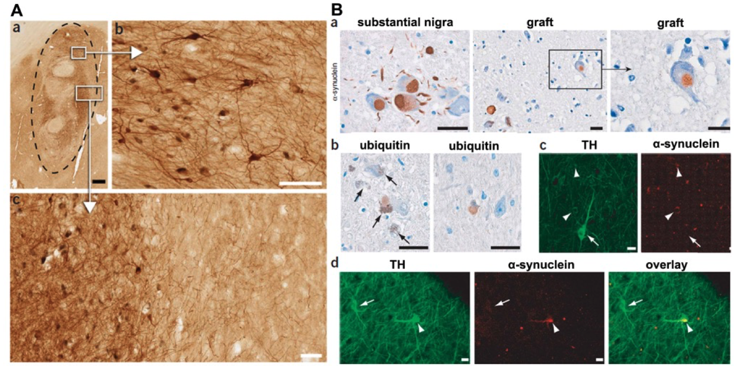 我们对PD患者移植11-16年胎儿中脑多巴胺能神经元进行追踪分析,结果显示,移植的中脑多巴胺能神经元形态良好(A),在部分移植的多巴胺能神经元中发现明显的PD病理性蛋白—α-synuclein的沉积(B)。我们发现分别移植12年及16年的PD患者中约40%及80%的TH阳性神经元出现大量α-synuclein的沉积。结果表明移植中脑多巴胺能神经元十年PD患者,大多数中脑多巴胺能神经元在功能上均未受损,而接受移植的PD患者能够得到症状缓解。该研究的重大发现为PD发病机制的研究提供重要思路。