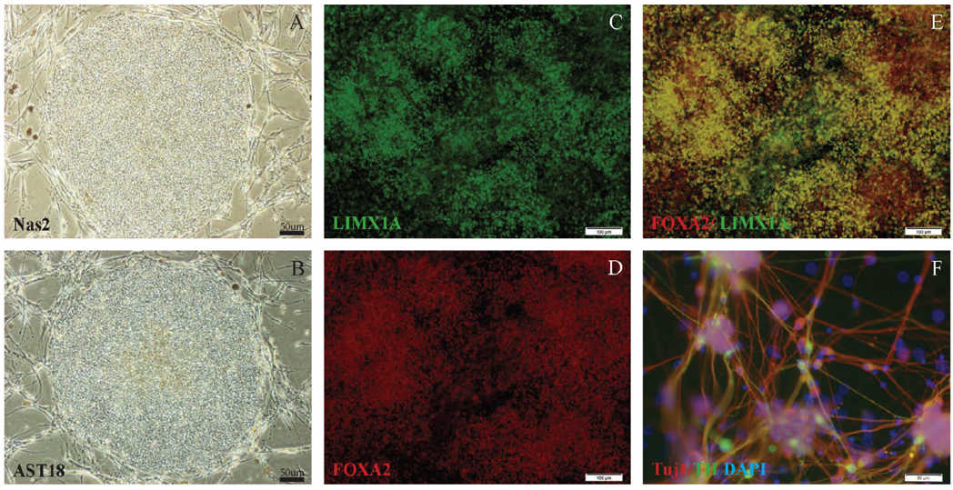 上图显示诱导型多能干细胞克隆(A、B)多巴胺能分化12天(C、D、E)和分化25天(F)的形态。