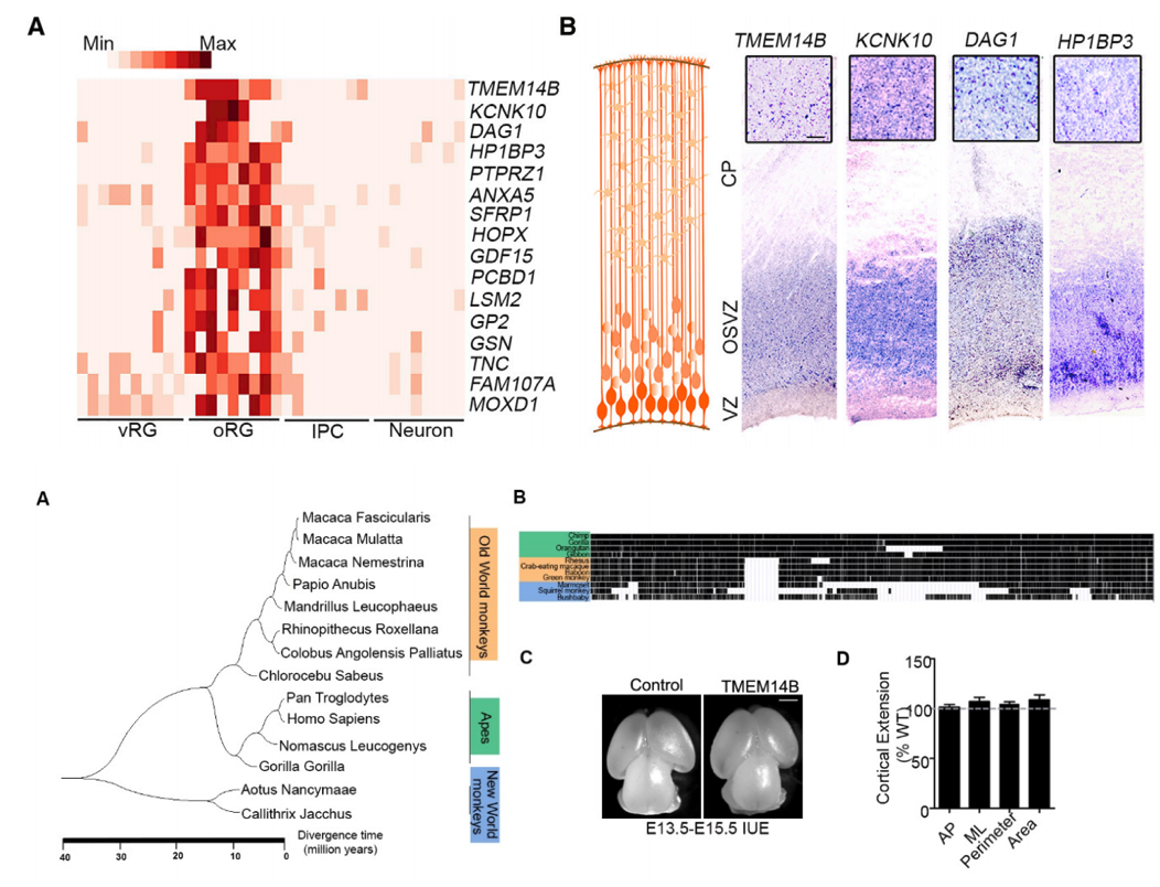 TMEM14B是灵长类动物特有基因,本人通过新开发的算法发掘出TMEM14B,并认为TMEM14B是oRG细胞的特异性基因。TMEM14B可以促进oRG细胞的快速扩增,从而促进皮层发育以及大脑沟回的形成。