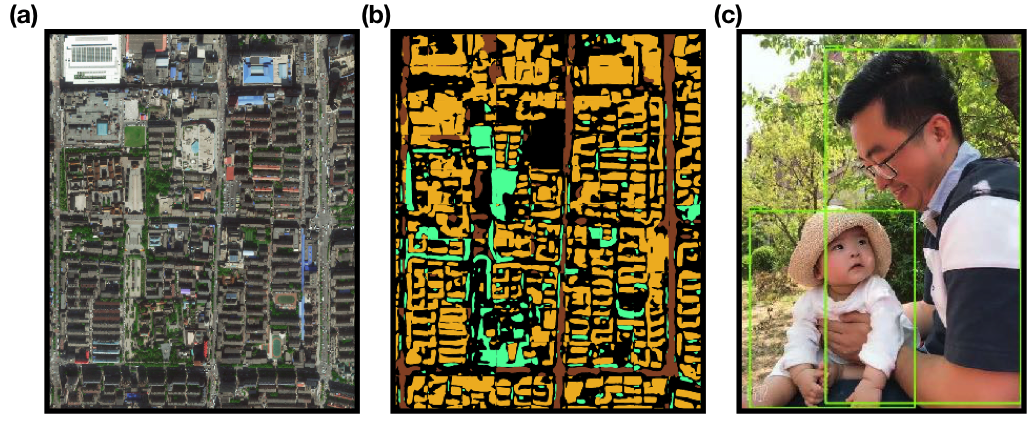 (目前研发的基于地理人工智能健康环境社区诊断工具开发。(a) 沈阳某社区的卫星高清图片,(b) 通过Satellite-Segmentation模型识别社区中绿植和 (c) 通过VGG16模型识别图片中的人物。)