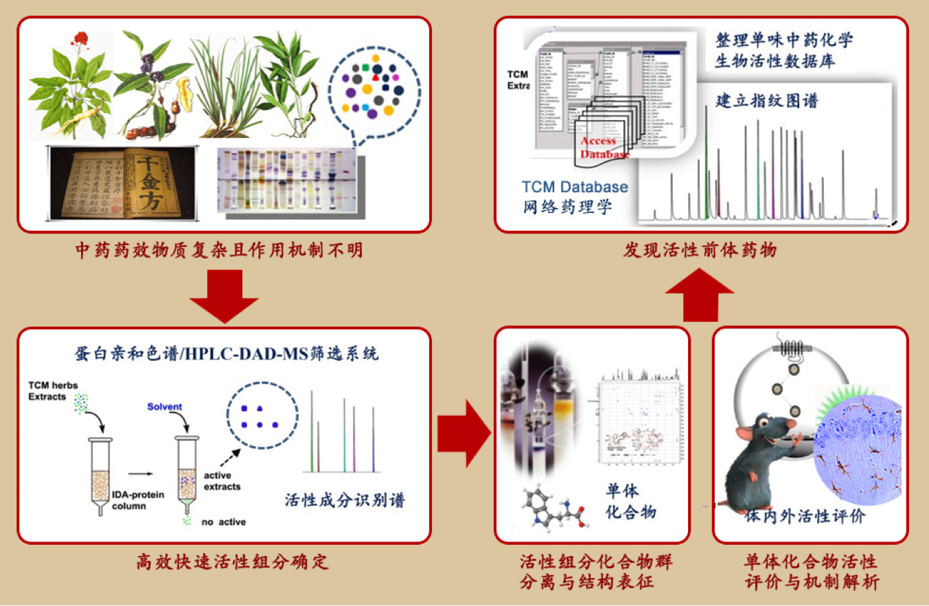 “中国医药学是一个伟大的宝库”,从道地药材中挖掘抗脑衰老和相关疾病的药效物质是现代中医药领域的主要研究方向之一。在对辽藁本、黄芪、白芍、玄参、地黄、泽泻和小茴香等药材活性组分物质基础进行分离纯化和结构解析的基础上,我们利用网络药理学技术、阿尔茨海默病动物模型并结合体外细胞实验,对分离纯化获得的活性化合物进行药效学评价,系统分析其抑制蛋白错误折叠的作用机理及具体靶点,从抑制蛋白错误折叠、阻抑金属离子参与Aβ聚集过程、缓解炎症损伤、以及影响Aβ前体蛋白APP表达等多角度阐释活性分子延缓阿尔茨海默病病理进程的药效学机制,为抗脑衰老和神经退行性疾病新药研发提供基础。