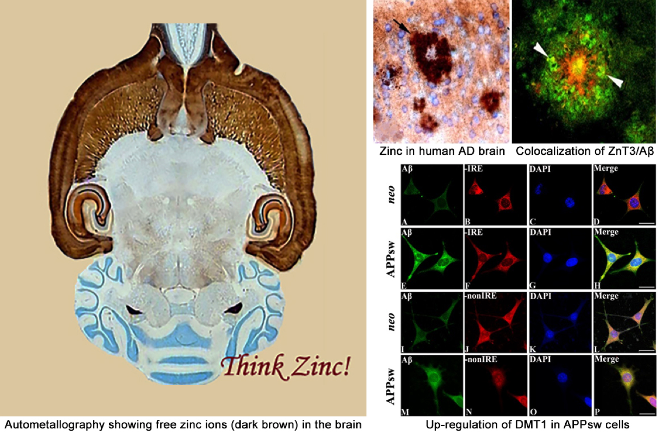 在脑衰老和神经退行性疾病(阿尔茨海默病和帕金森病)的病理生理过程中,脑内金属离子(铁、锌、钙等)呈渐进性蓄积,通过促进自由基产生、激活氧化应激反应和诱发铁死亡等事件,参与神经退行性疾病的发生与发展。然而,金属离子脑内蓄积的“源头”问题一直不清。通过对阿尔茨海默病病人和转基因小鼠大脑进行分析,我们发现跨膜转运锌离子的ZnTs和转运铁离子的DMT1在转基因小鼠大脑的表达水平显著升高,是导致脑内金属离子超载的“元凶”。同时,我们尚发现蓄积于脑的金属离子通过上调APP剪切酶的表达与活性,促进β-淀粉样蛋白(Aβ)的产生与沉积,从而加快阿尔茨海默病的病理进程。相关研究成果证实并进一步完善了关于阿尔茨海默病发病机制中的“金属离子假说”。