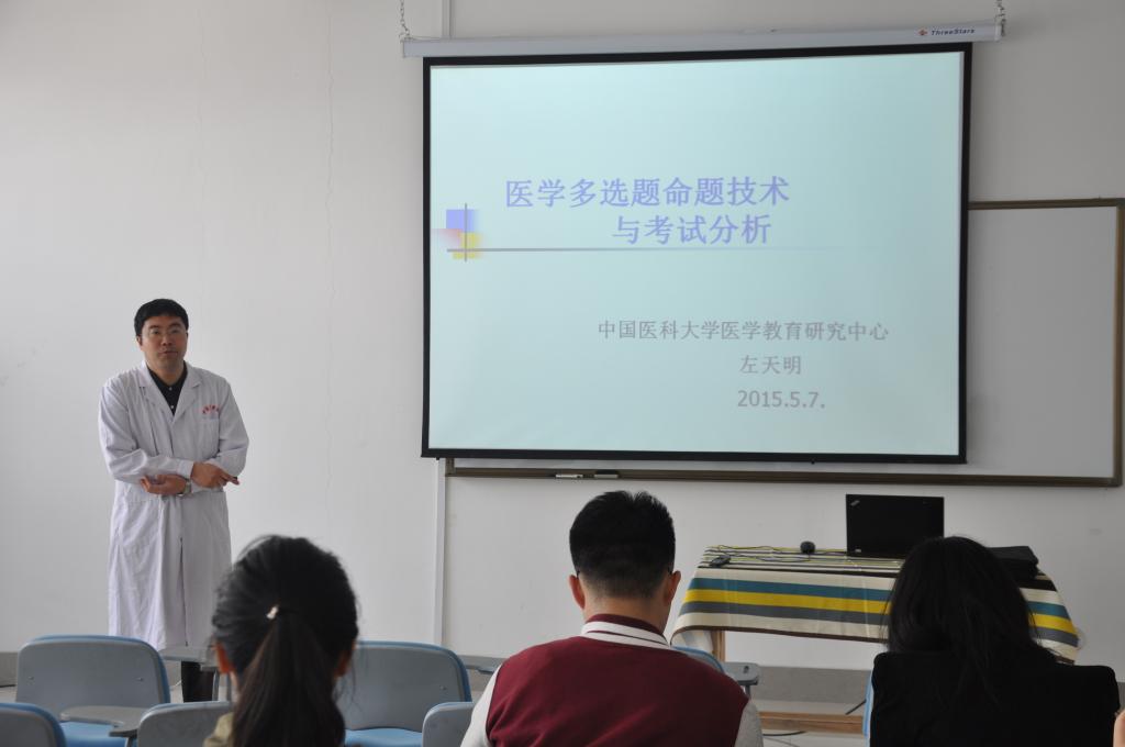 2015年5月7日,中国医科大学教师教学发展中心、医学教育研究中心举办了2015年第四期“教师教学发展中心workshop”。本次讲座由医学教育研究中心左天明老师主讲,与来自各院系的数十名老师和同学进行了互动研讨。本次workshop介绍了医生岗位胜任力评价的总体框架,然后结合实例重点讲解了医学多选题的命题技术,最后结合教育测量学理论简要介绍了成绩分析、试卷分析和试题分析的有关概念和具体方法。