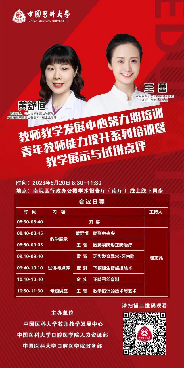 为促进青年教师成长,进一步提升青年教师教学理念、教学技能与方法,现邀请在中华口腔医学会教育教学基本功展示中获奖优秀教师——中山大学牙体牙髓病学黄舒恒老师、空军军医大学口腔正畸学王蕾老师进行教学展示与试讲点评活动,并进行专题讲座。