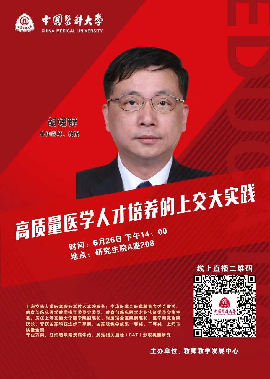 为加强教师教学发展,更新医学教育观念,促进教育研究实践,提升教育教学质量,我校从实际需求出发,特邀请上海交通大学胡翊群教授做主题为“高质量医学人才培养的上交大实践”讲座。