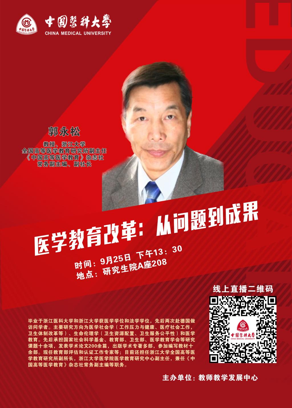 为加强教师教学发展,更新医学教育观念,促进教育研究实践,提升教育教学质量,我校从实际需求出发,特邀请浙江大学郭永松教授做主题为“医学教育改革:从问题到成果”讲座。