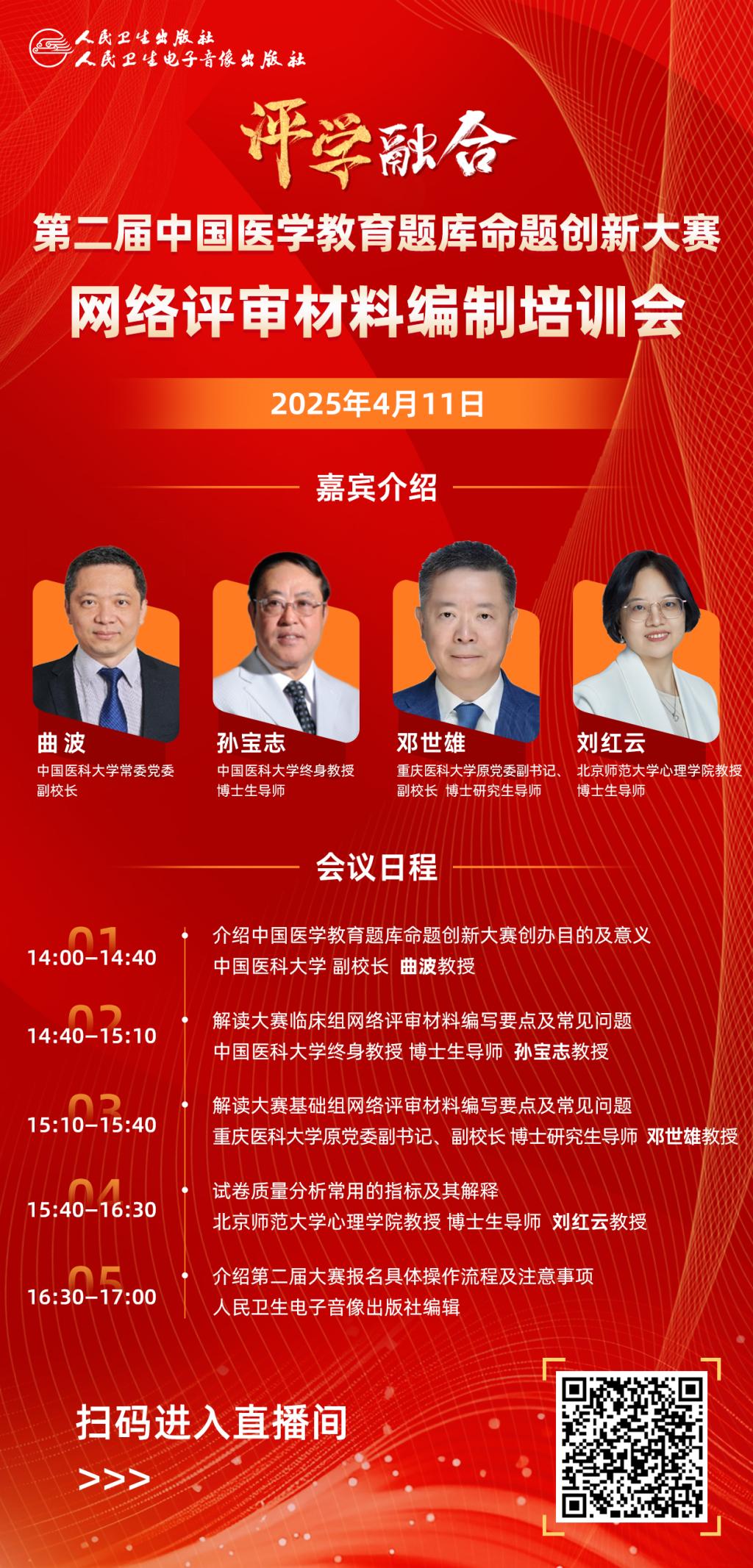 为更全面了解中国医学教育题库命题创新大赛的目的及意义、网络评审材料编写要点及常见问题、试卷质量分析常用指标及其解释、报名具体操作流程及注意事项等,拟定于2025年4月11日举办“第二届中国医学教育题库命题创新大赛网络评审材料编制培训会”直播,有关事项通知见附件。