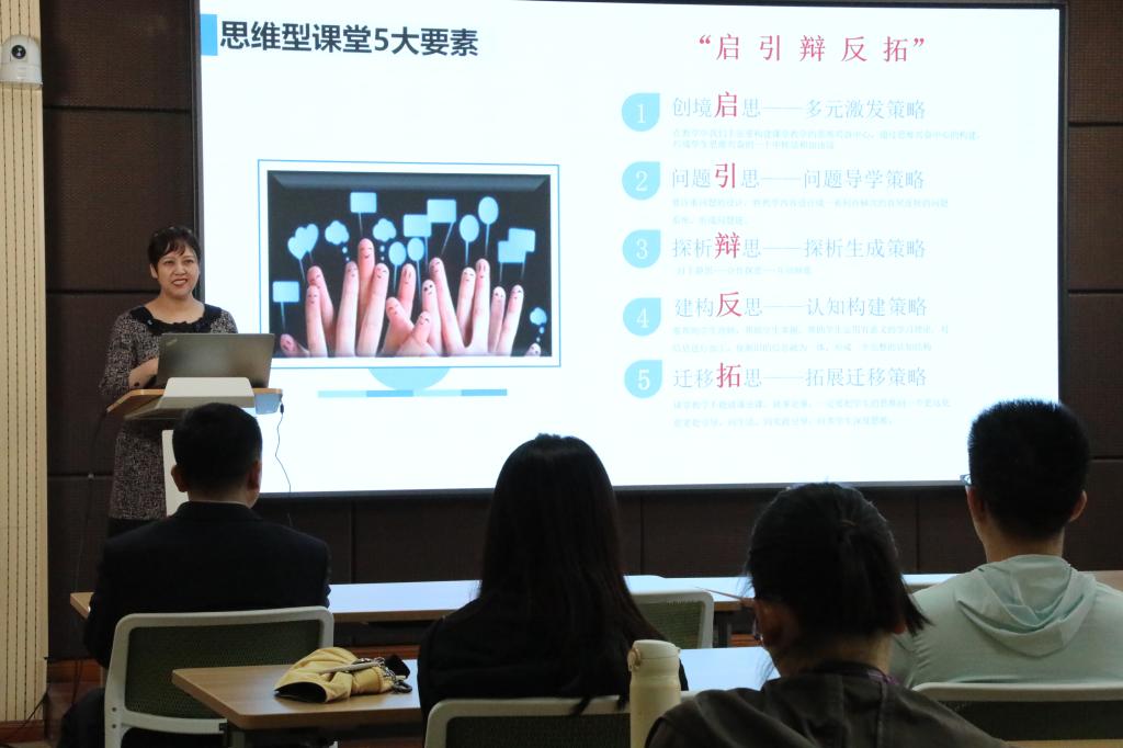 侯阳教授首先介绍自党的十八大以来,党和国家作出建设“教育强国”的重大决策,彰显了教学创新的重要性和必要性。接下来从“道”——理念、“术”——方法,两方面阐释如何创建思维型课堂。最后结合实际案例,丰满理论知识,使参会教师更好地理解思维型课堂的内涵。参会教师积极互动,反响热烈。