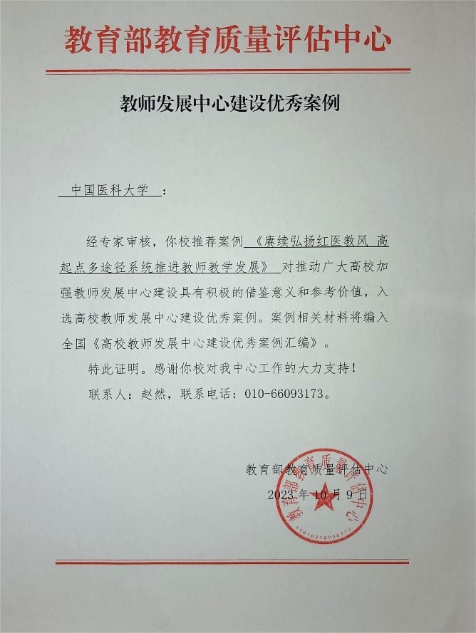 近日,教育部教育质量评估中心公布全国高校教师发展中心建设优秀案例,我校教师教学发展中心报送的《赓续弘扬红医教风,高起点多途径系统推进教师教学发展》入选,案例材料编入全国《高校教师发展中心建设优秀案例汇编》。