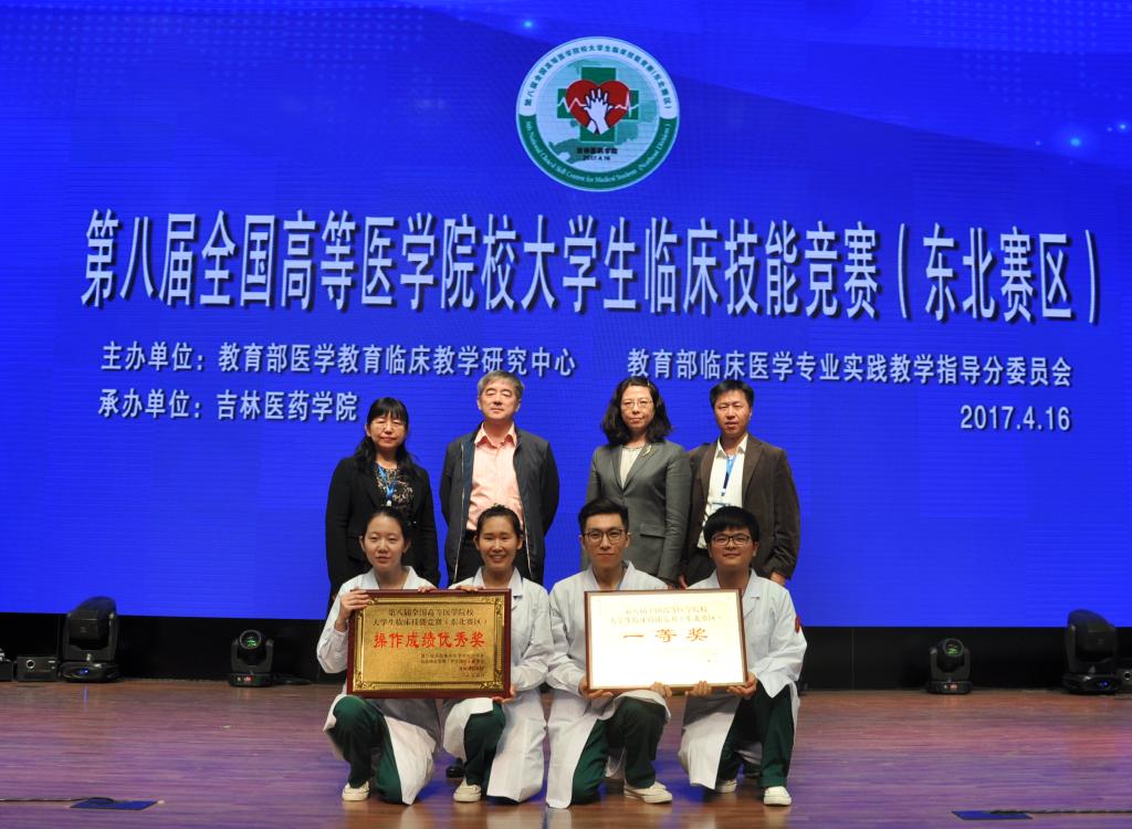 2017年4月16日,第八届全国高等医学院校大学生临床技能竞赛(东北赛区)在吉林医药学院落下帷幕。教务处欧凤荣处长领队,由2011级(97期七年制)临床医学专业王肜治、陈欣欣、赵楠溪、林建贞4名学生组成的参赛队,与东北三省共13所医学院校的14支参赛队伍同场竞技。经过一天的激烈角逐,最终我校代表队凭借良好的发挥、优异的成绩,获得团体一等奖、操作成绩优秀奖、妇科基本操作个人优秀奖,顺利晋级5月中旬在郑州大学举办的全国总决赛,这是我校连续八年进军全国总决赛。