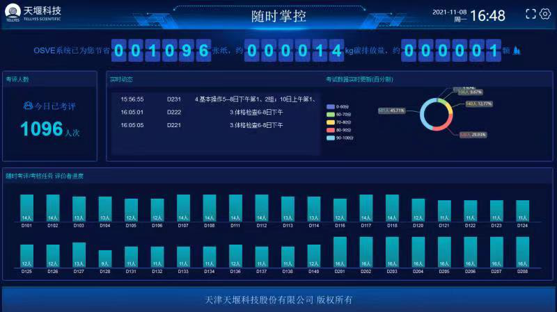 其中,OSVE智能化考试管理平台应用于技能考核,可实现评分的自动化和无纸化。考核中,考官使用PAD或手机进行智能化排考、评分,实现自动汇总考试成绩。正式考核开始前,学校联合平台技术人员组织全体考官进行了系统操作培训。