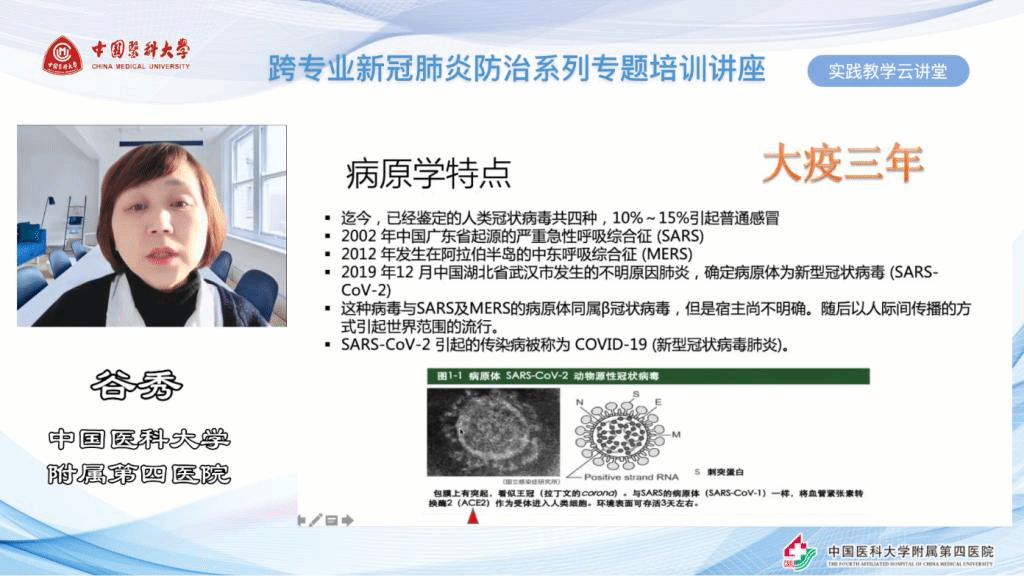 为提高医学生对新冠病毒感染临床诊治的认识,将临床理论知识和临床实践相结合,更好地做到学以致用,学校教务处于1月11日组织了一期特别的实践教学云讲堂活动——跨专业新冠肺炎防治系列专题培训讲座,邀请中国医科大学附属第四医院内科教研室副主任、呼吸内科/感染内科谷秀主任主讲《近期奥密克戎病毒感染临床诊疗的思考》。