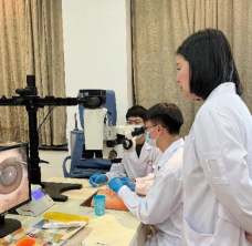 在分组练习中,同学们在显微手术操作台上进行猪眼球操作,由赵江月教授及冯莉老师对同学们进行一对一指导,耐心地对每一位同学提出的疑惑做了解答。同学们互动积极,学习热情高涨,现场气氛十分活跃,课程结束后仍继续练习显微操作,并表达了对今后眼科操作课程的期待。一位同学感慨地说:“非常感谢第四临床学院眼科教研室为我们创造的学习平台,也非常感谢赵教授对我们的无私教导,这次课程让我们受益匪浅,使我们对眼科及眼科手术产生了浓厚的兴趣,希望以后能有更多机会对眼科进行深入了解。”