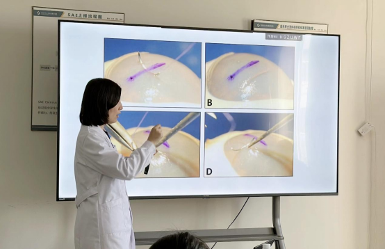 眼科手术是显微外科手术的代表之一,操作精细、应用广泛,从日常的眼科急诊显微缝合术、广泛应用的近视屈光手术,到精准的屈光性白内障手术、复杂的玻璃体切割手术等,与全年龄层人民群众的眼健康息息相关。赵江月教授首先对眼科显微手术的基本理论、显微镜的使用方法及角膜裂伤缝合的手术技巧进行详细讲解,为同学们接下来的实践操作打下了良好的基础;同时,采用图片、视频和手术器械的实物展示,使同学们对眼科手术操作及器械有了直观清晰的认识,增加了同学们对实践操作的好奇与渴望。