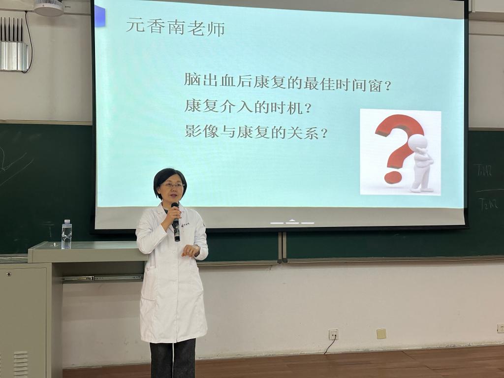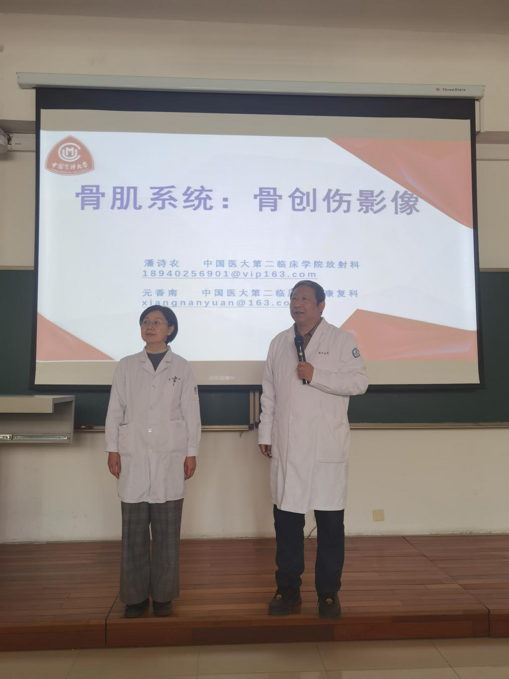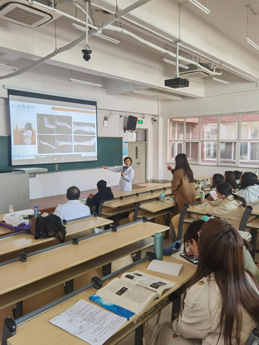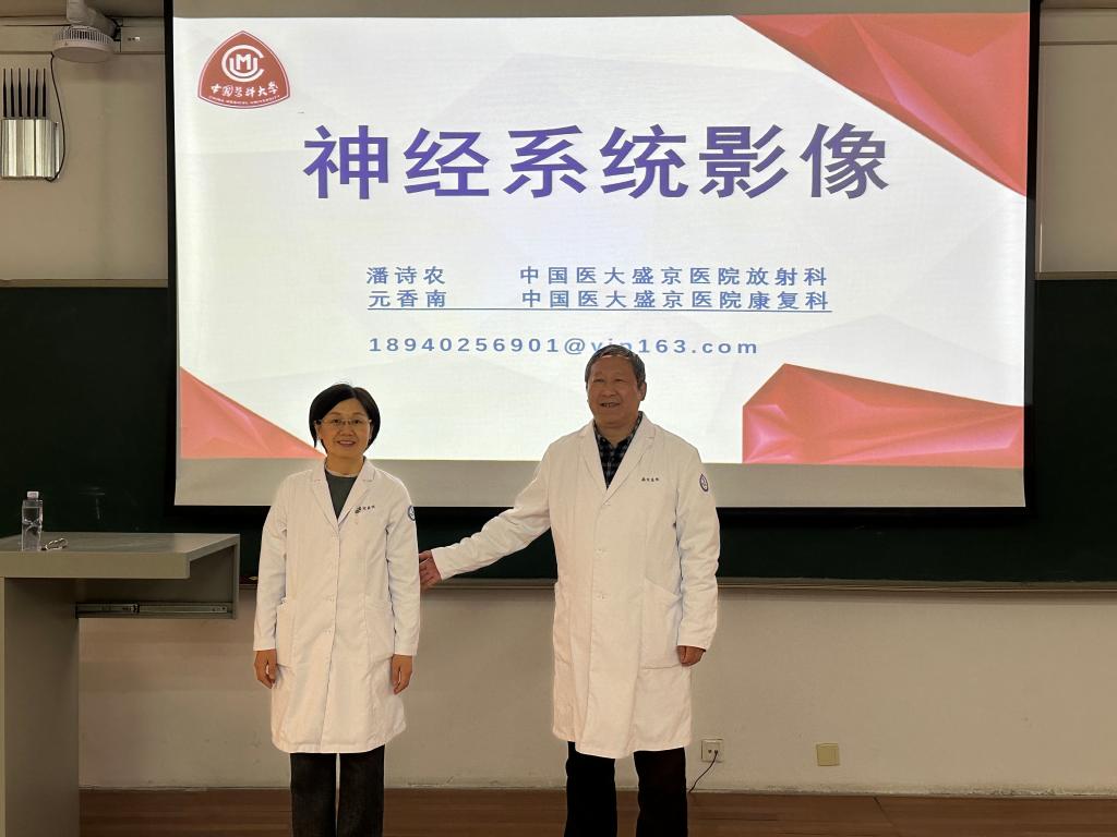 温暖的春日午后,中国医科大学公共教学楼A402教室里,一双双充满求知欲的眼睛,正注视着讲台上的潘诗农老师和元香南老师。这是本学期108k康复治疗学专业《医学影像学》课程双师课堂的影像。课堂上,来自第二临床学院放射影像学教研室的潘思农教授和康复医学与理疗学教研室的元香南副教授联袂授课,带来了一节新颖多彩的课程。两位老师配合默契,深入浅出,在潘老师为同学们详细讲解疾病的检查方法与影像特征后,元老师随即运用临床询证,通过病例分析将理论与康复实践完美结合,让学生们不仅学到了影像专业知识,还与临床密切结合,提升学生作为康复治疗师的职业认同感,让学生们的学习过程有趣有盼,少了理论课的枯燥,多了专业课的兴趣和专注。