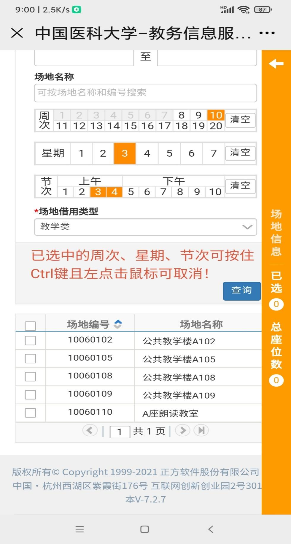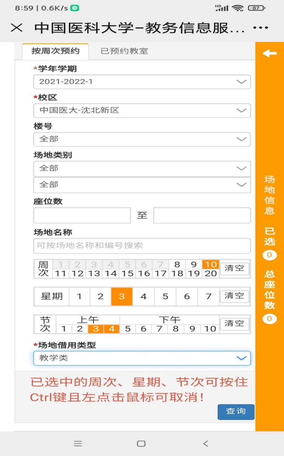 再点击查询按键,在页面的最下方,显示出所有符合预约条件的教室,选定需要预约的教室。