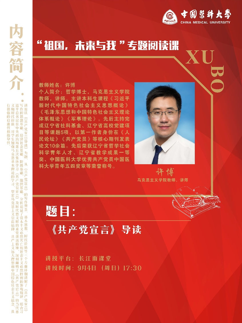 为落实《中共辽宁省委教育工作委员会辽宁省教育厅关于组织开展“喜迎二十大 奋进新征程”2022年秋季“开学第一课”活动的通知》(辽委教通〔2022〕65号),全面贯彻党的教育方针,落实立德树人根本任务,培养德智体美劳全面发展的社会主义建设者和接班人,学校开展一堂专为青年打造的“祖国,未来与我”专题阅读课,请同学们认真参加学习。