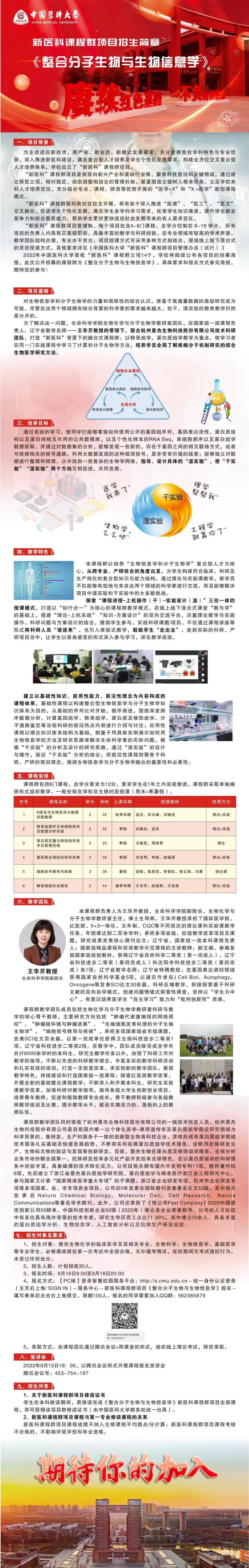 2022年中国医科大学首批“新医科”课程群立项14个,学校将陆续公布各项目的招募海报,此次公开招募的课程群为《整合分子生物与生物信息学》,具体要求和报名方式参见海报,期待您的参与!