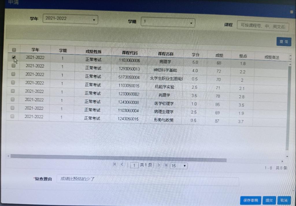 点击“查询”按钮本学期各门课程显示在窗口中,勾选所要复查的一门课程,再在下方的“复查原因”框中写明原因后,点“提交”或“保存草稿”,如果想复查多门课程,反复上述操作。注意想要复查的课程必须为提交后才有效。